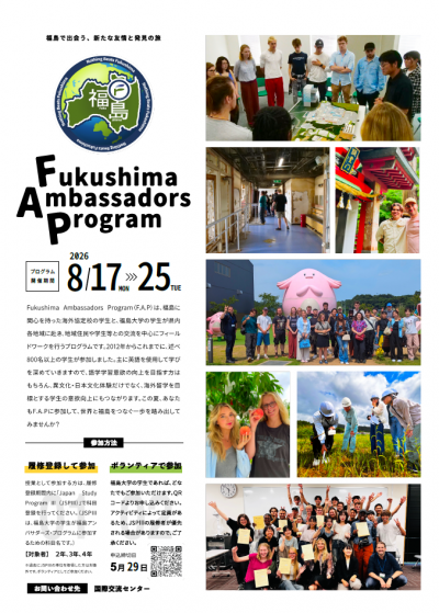 Fukushima Ambassadors Program(F.A.P)は、福島に関心を持つ海外の協定校の学生と、福島大学の学生がチームとなって県内各地を訪れ、地域住民や学生との交流を通してフィールドワークを行うプログラムです。